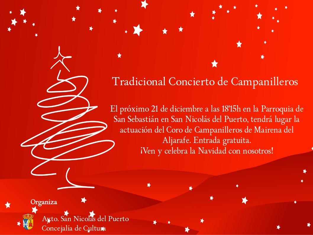 El próximo sábado 21 de diciembre de 2013, en la Parroquia de San Sebastián de San Nicolás del Puerto, se realizará el tradicional concierto de Navidad de Campanilleros. La actuación estará a cargo del Coro de Campanilleros de Mairena del Aljarafe. El Concierto se realizará a las 18'15h y la entrada será gratuita. El acto se encuentra dentro del Programa de Fomento a la Cultura 2013, que nuestro Ayuntamiento lleva en colaboración con la Excma. Diputación Provincial de Sevilla.